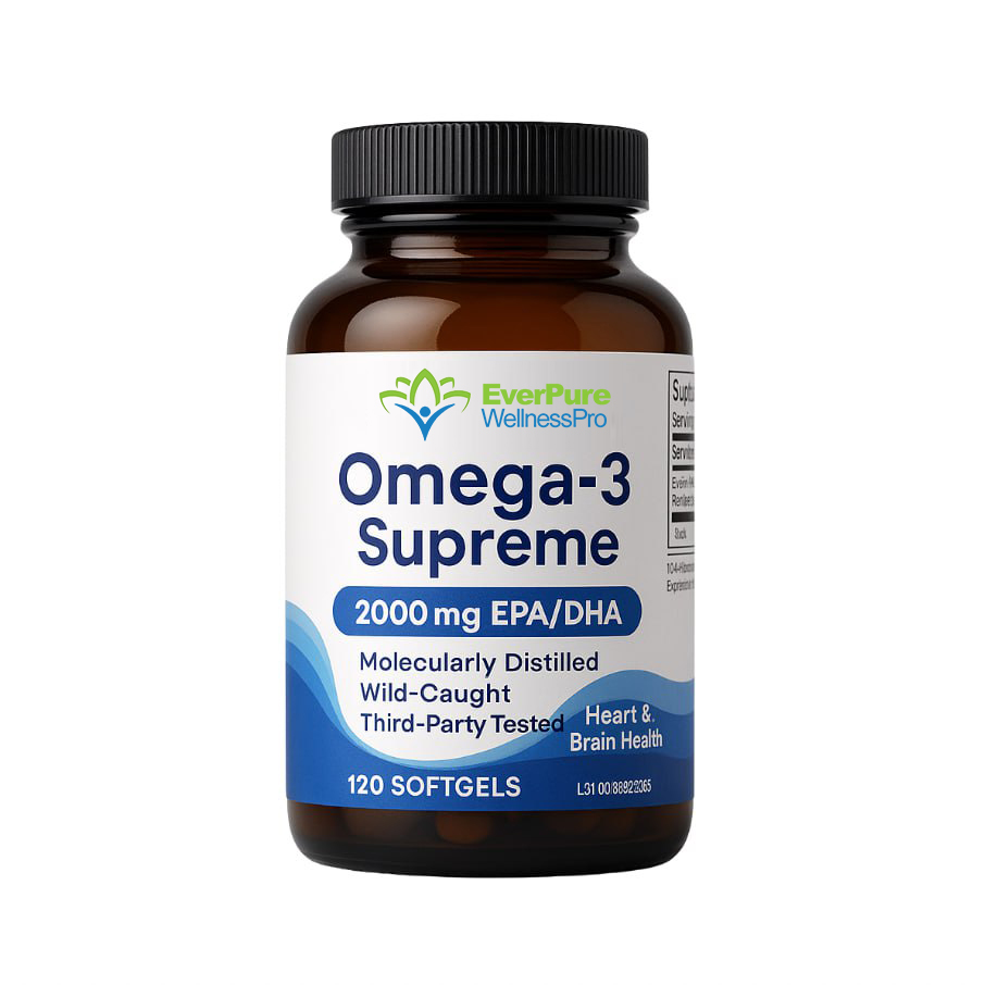 Premium omega-3 fish oil with 2000mg EPA/DHA per serving. Molecularly distilled, wild-caught, and third-party tested for purity. May support heart